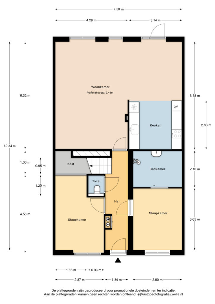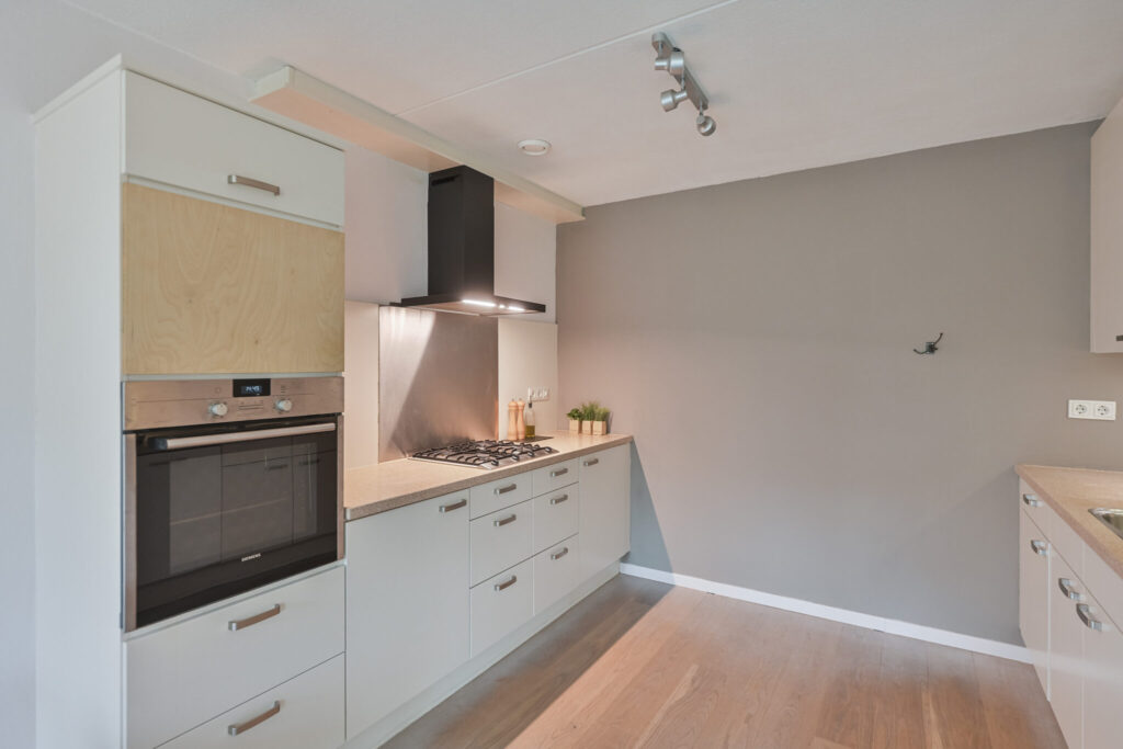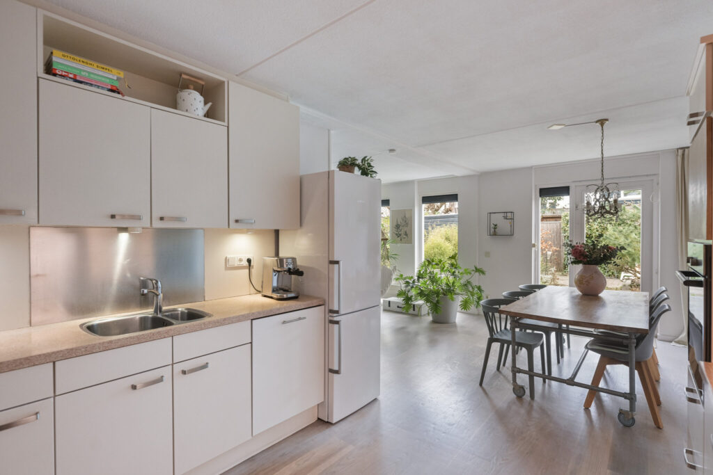 De begane grond is opvallend breed opgezet, met de woonkamer en halfopen keuken over de volle breedte van circa 7,5 meter. Dat zorgt voor veel lichtinval en een prettige verbinding met de tuin. De lichte afwerking en houten vloer geven de ruimte een warme uitstraling.