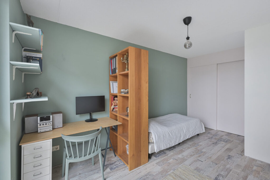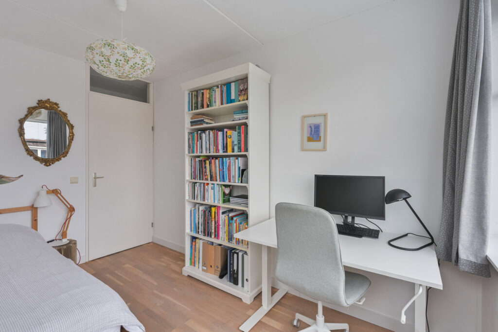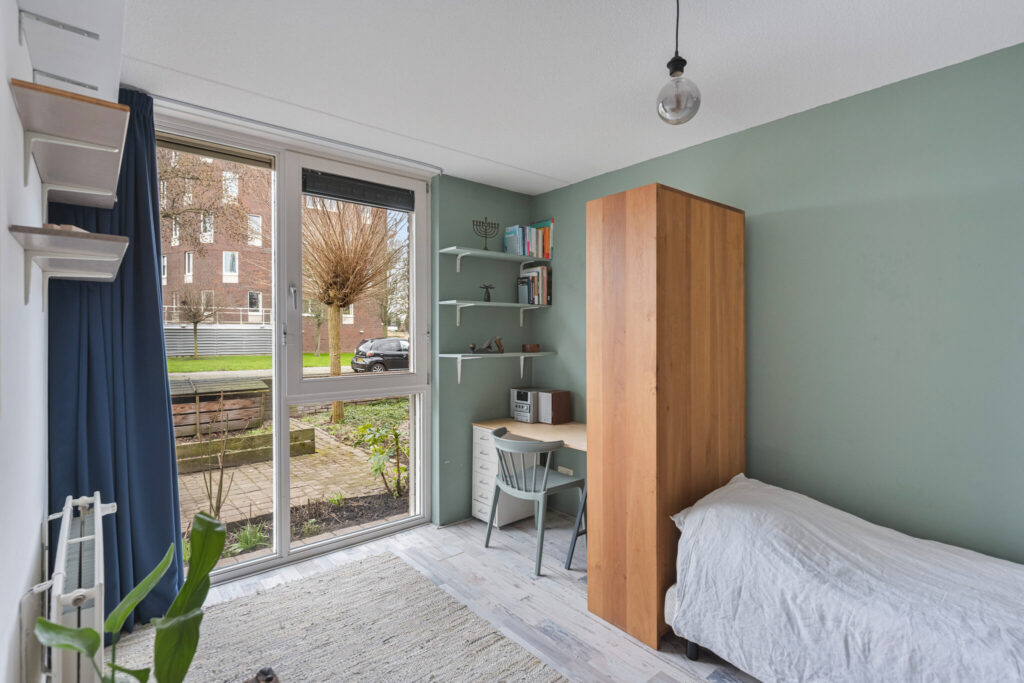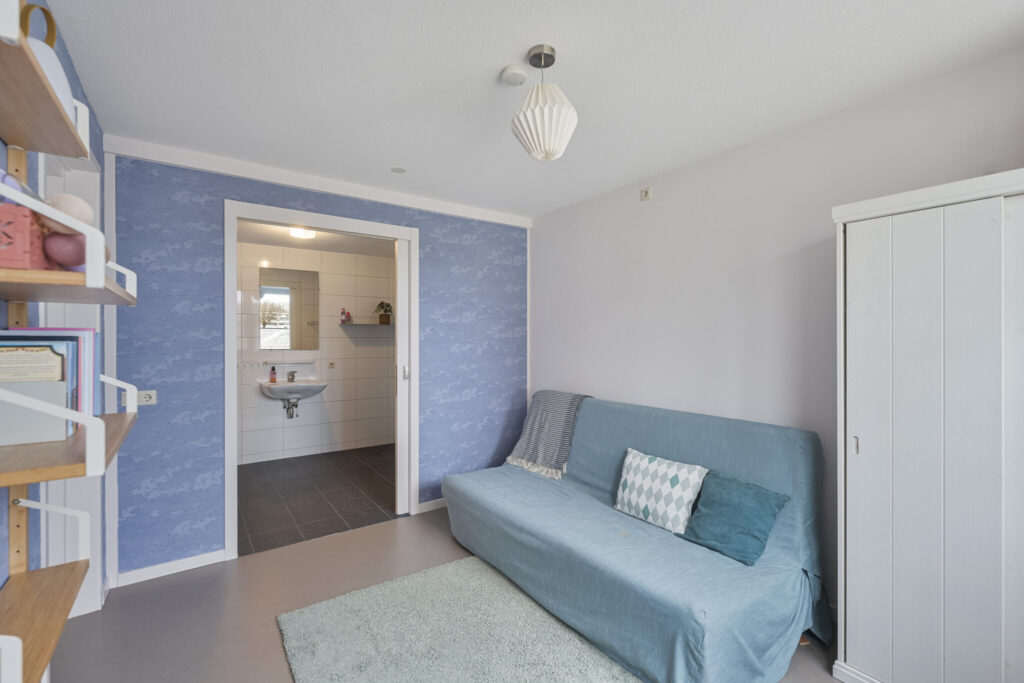 Aan de voorzijde bevinden zich twee extra kamers, waarvan één directe toegang heeft tot een ruime badkamer. Dit maakt gelijkvloers wonen mogelijk. Denk aan een slaapkamer met badkamer op de begane grond, maar ook aan een praktijkruimte, salon of kantoor aan huis. Deze woonlaag is volledig rolstoeltoegankelijk. Dankzij de voortuin is er extra afstand tot de straat, wat zorgt voor meer privacy aan de voorzijde.