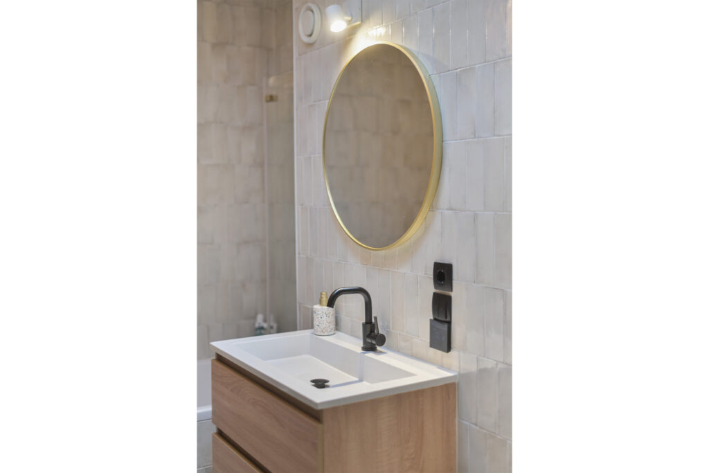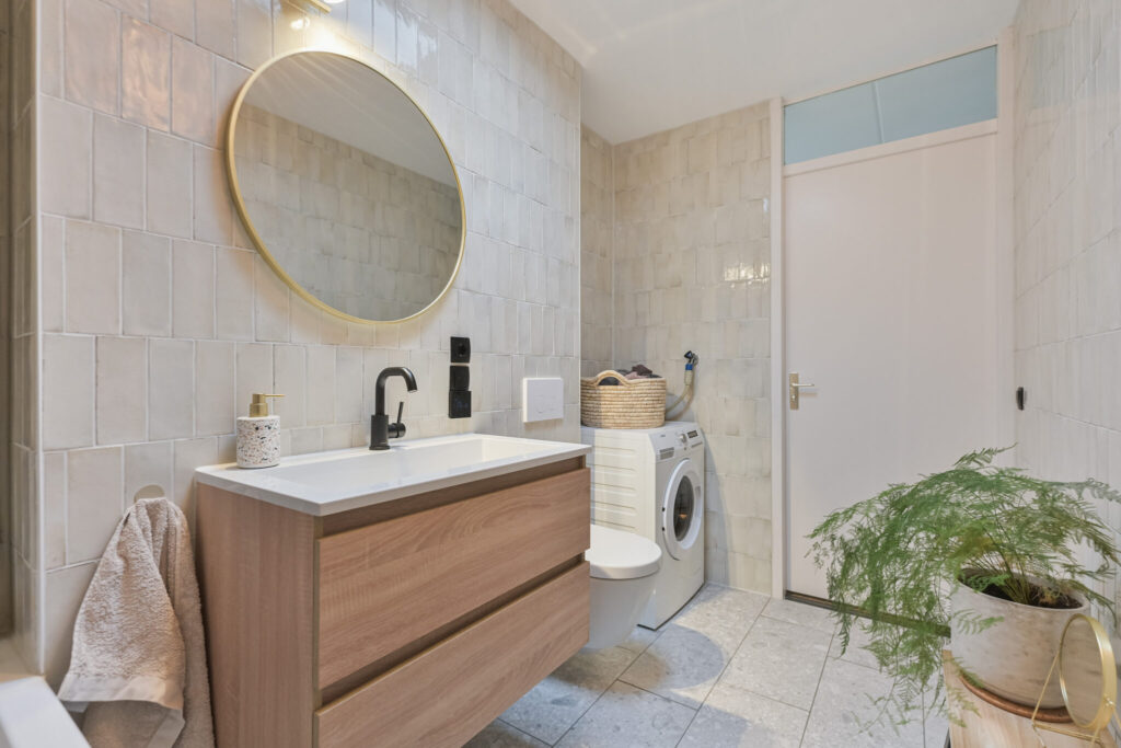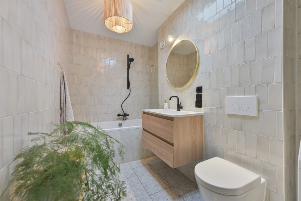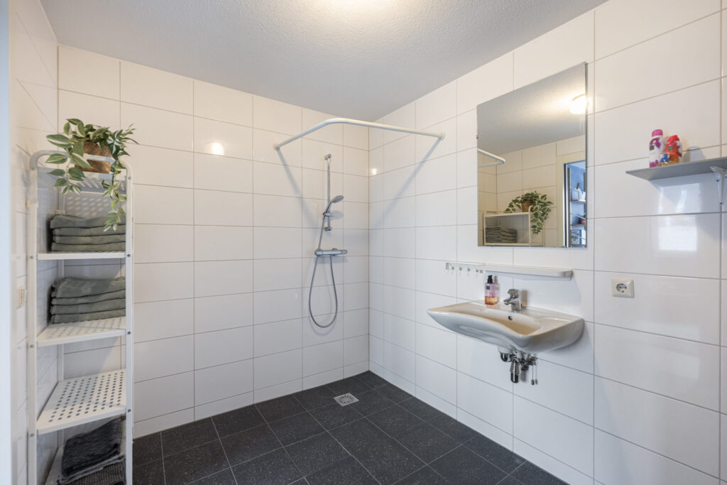 De badkamer is in 2024 vernieuwd en modern uitgevoerd met een ligbad met douche, wastafelmeubel en tweede toilet.
