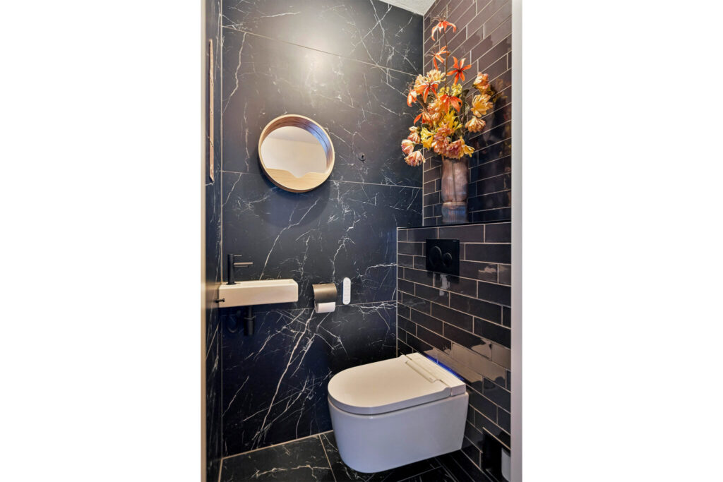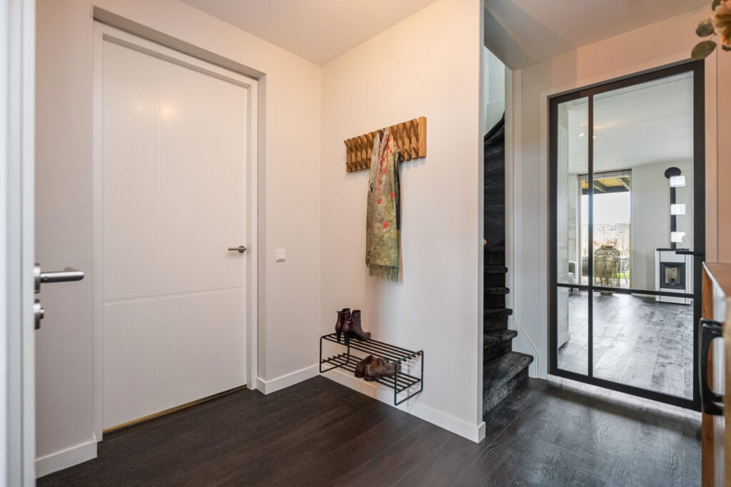Je komt binnen in de ruime hal met toegang tot de toiletruimte. Deze is luxe afgewerkt met zwart marmerlook tegels en voorzien van een Geberit douchetoilet. Vanuit de hal bereik je via een luxe glasdeur met rookglas de woonkamer op de begane grond.