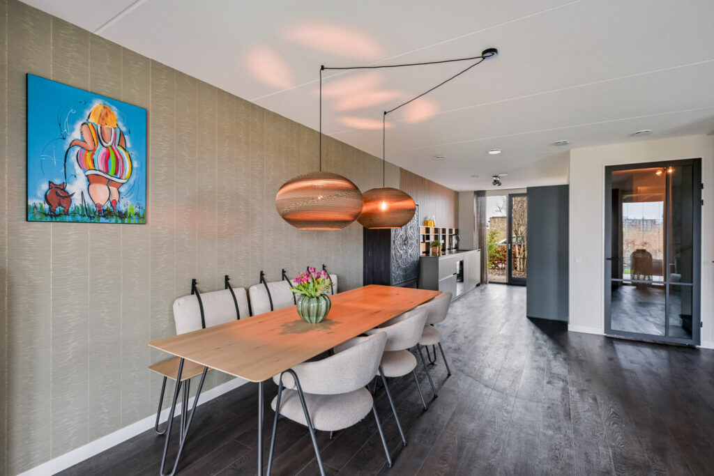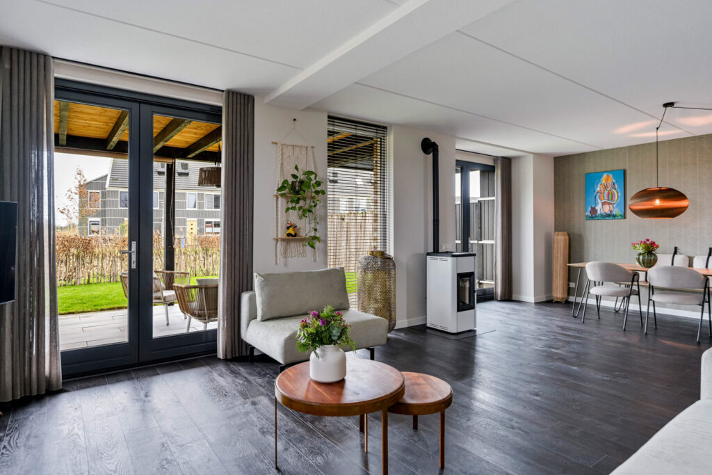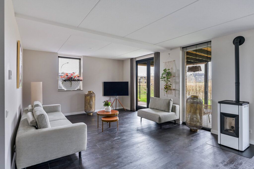 Op de begane grond ligt een stijlvolle PVC vloer met vloerverwarming, wat zorgt voor extra comfort en een rustige uitstraling. In de gehele woning zijn bovendien stijlvolle binnendeuren toegepast, wat bijdraagt aan de hoogwaardige afwerking. De aanwezige pelletkachel kan eventueel worden overgenomen en zorgt voor extra sfeer tijdens de koudere maanden.