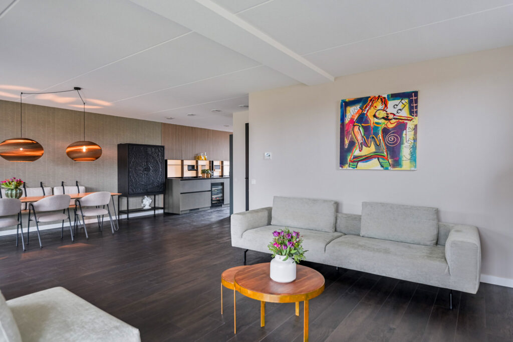 De woonkamer en keuken vormen samen een prettige en open leefruimte. In de woonkamer zorgen grote raampartijen, een extra zijraam en openslaande deuren voor een fijne verbinding met de tuin. Er is volop ruimte voor een royale zithoek en een grote eettafel. Via de openslaande deuren stap je zo de tuin in, waar aan de woning een fraaie overkapping is gerealiseerd om beschut buiten te zitten.