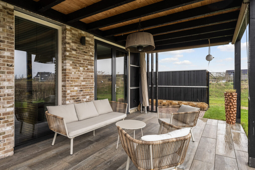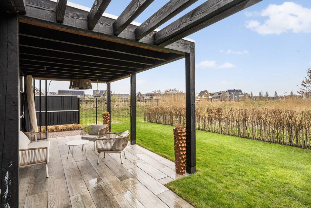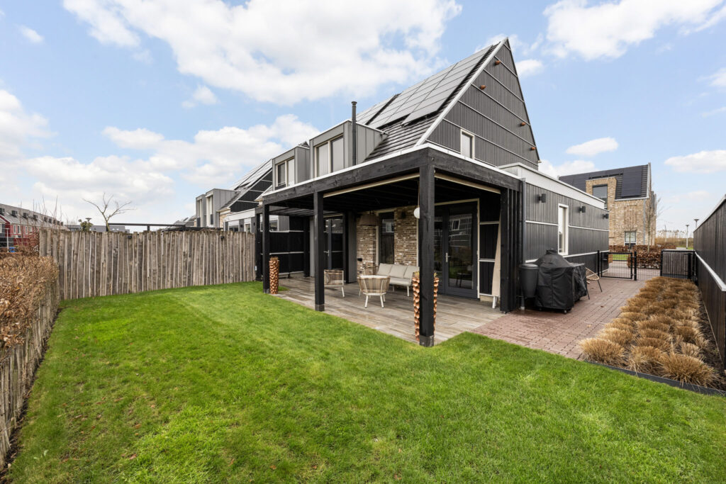 De achtertuin ligt gunstig op het zuidoosten en biedt een fijne combinatie van zon, ruimte en privacy. Onder de aangebouwde overkapping zit je heerlijk beschut.