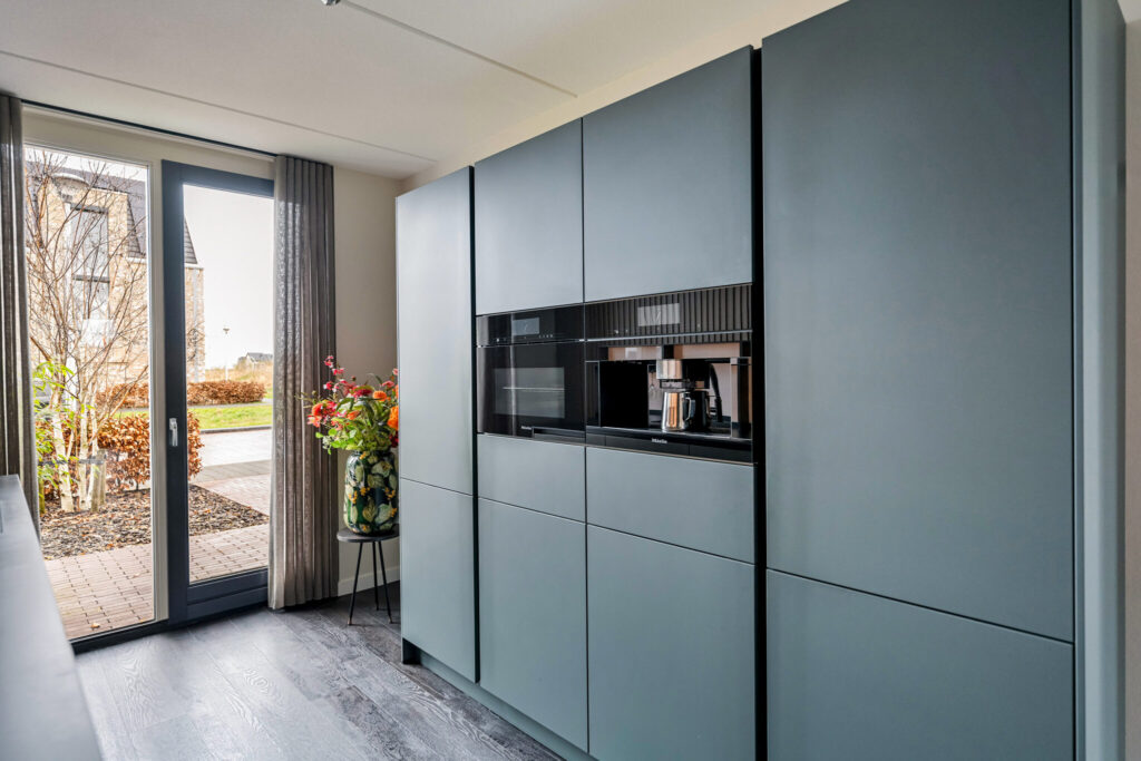 Aan de voorzijde van de woning bevindt zich de open keuken. De keuken is uitgevoerd in een elegante donkergroene kleurstelling en voorzien van hoogwaardige Miele inbouwapparatuur.