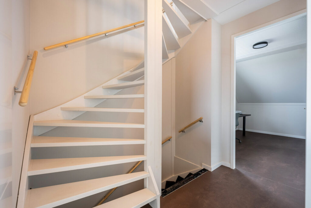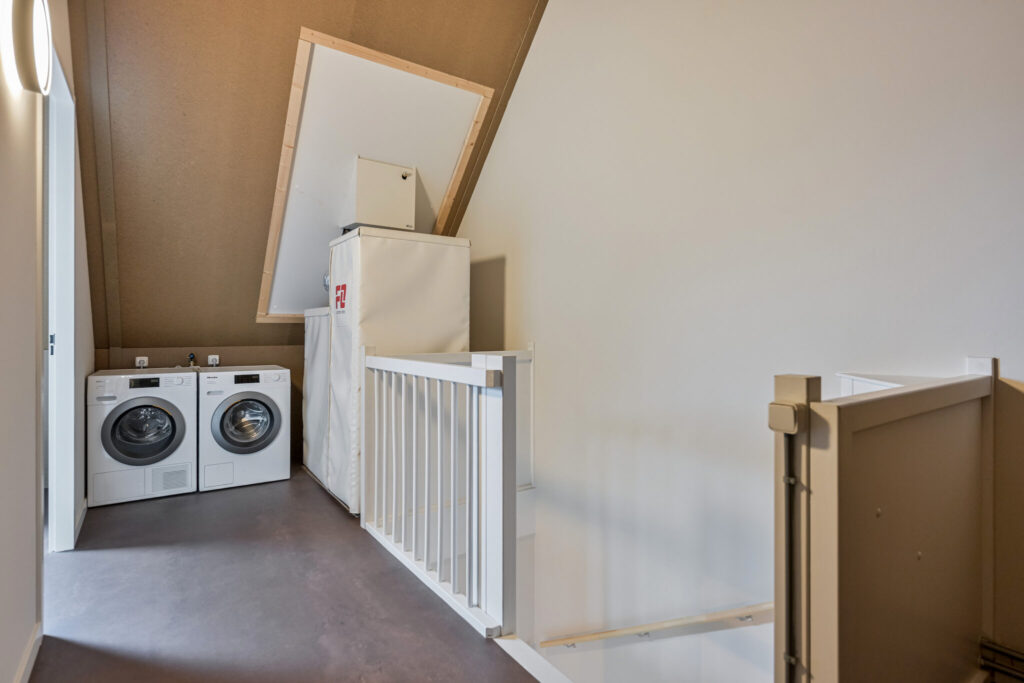 Daarnaast bevindt zich hier de technische ruimte met de warmtepomp, boiler en de aansluitingen voor wasmachine en droger.