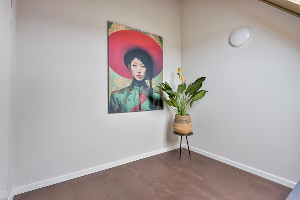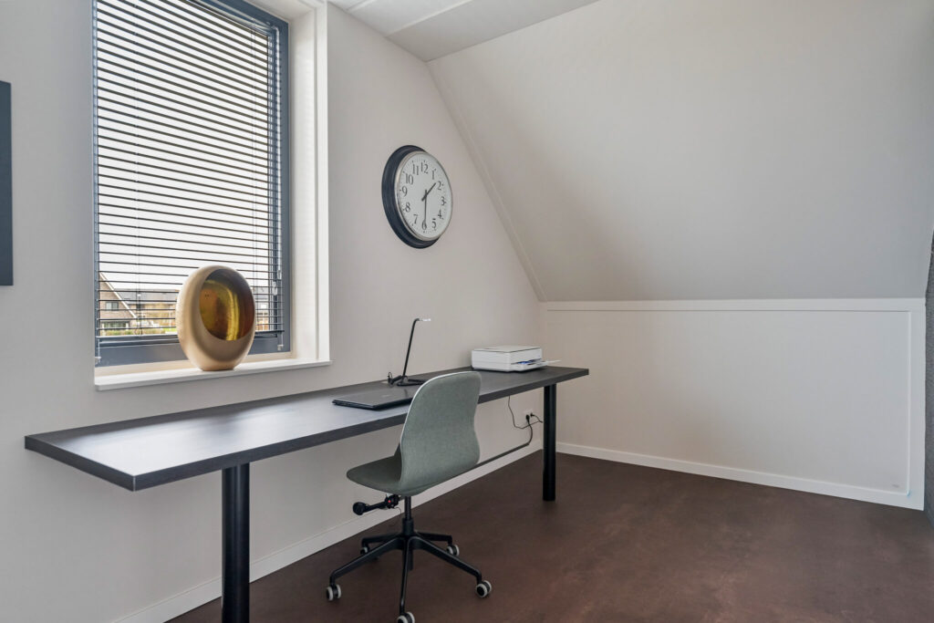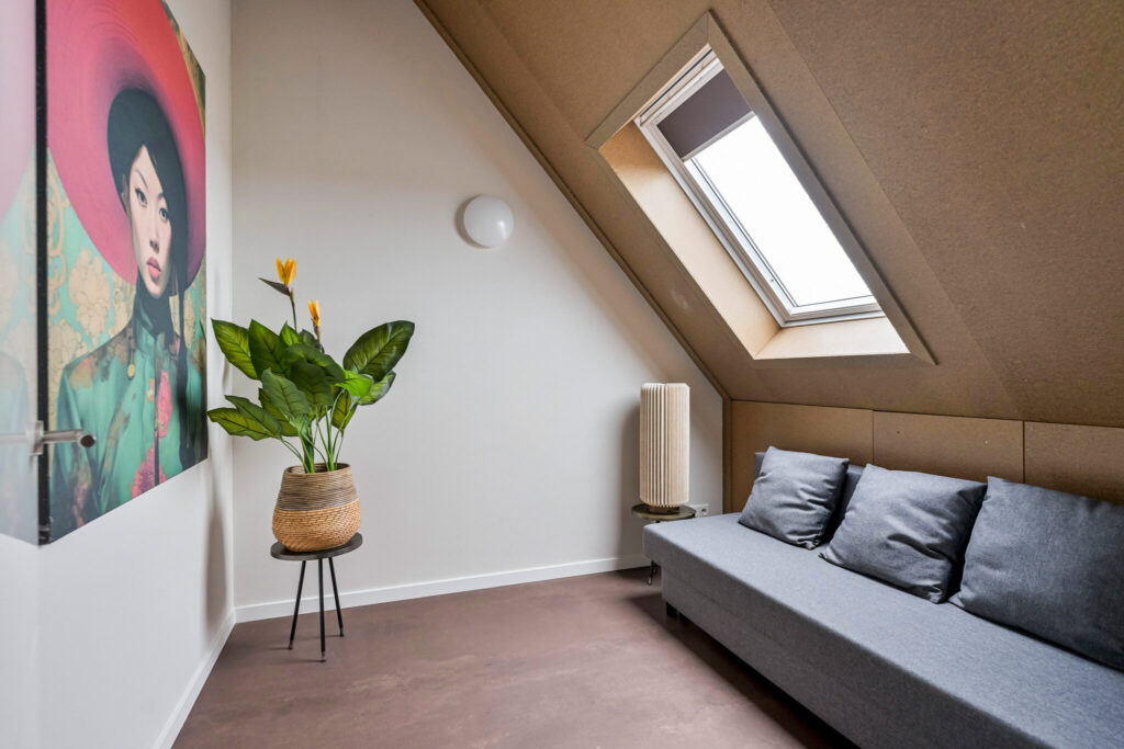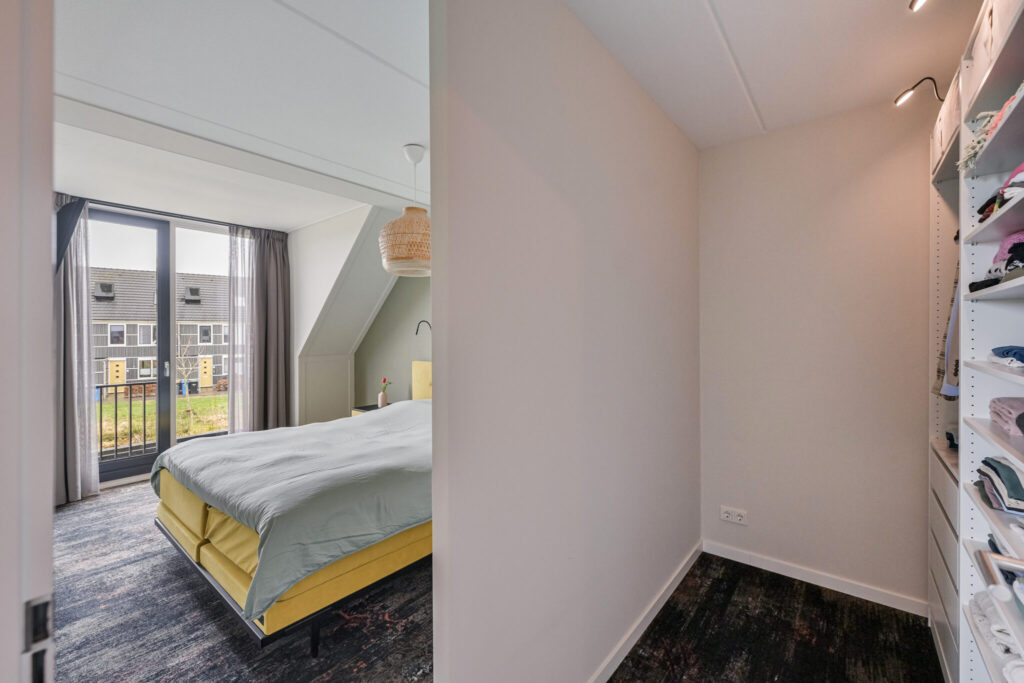 De tweede verdieping biedt nog eens een ruime slaapkamer met vloerverwarming, een dakraam en een grote inloopkast. Indien gewenst is deze verdieping ook in te delen in twee slaapkamers.