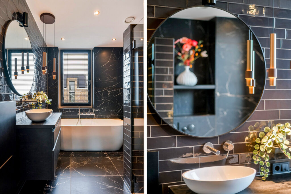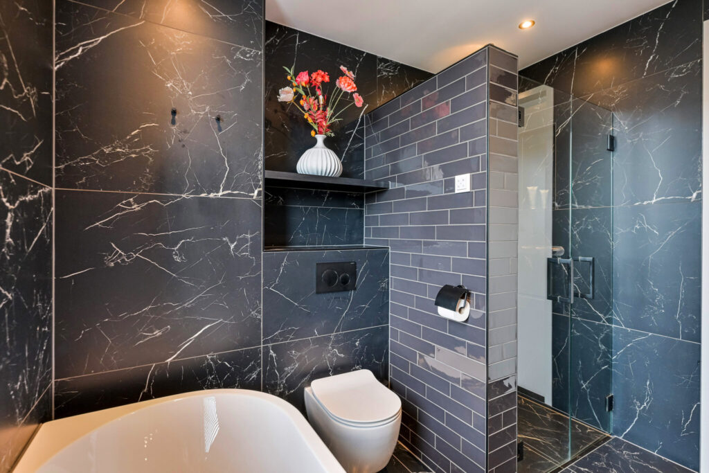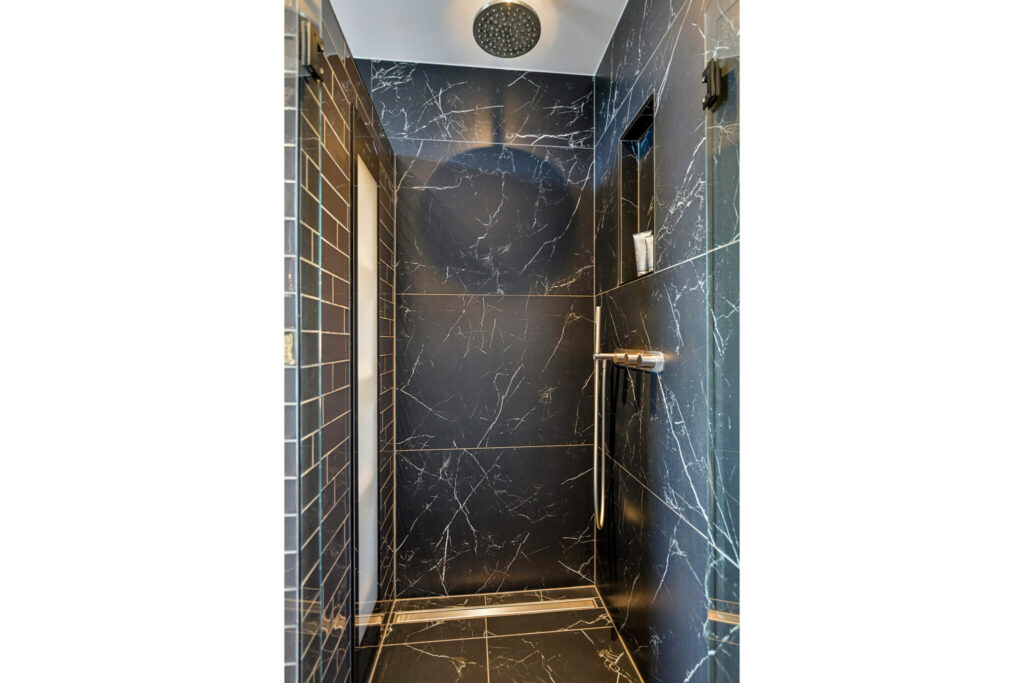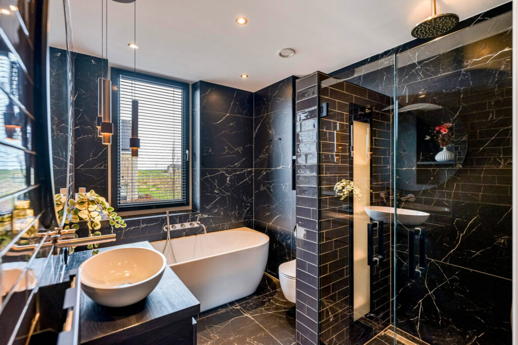 De badkamer heeft een luxe en eigentijdse uitstraling en doet denken aan een comfortabele hotelsuite. Je vindt hier een stijlvol wastafelmeubel met verlichte spiegel, een ruime inloopdouche met sunshower, een ligbad en een tweede toilet. Een fijne plek om de dag ontspannen te beginnen of juist rustig af te sluiten.