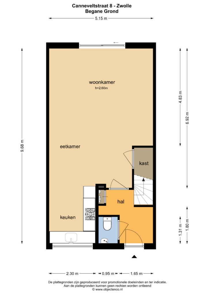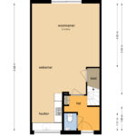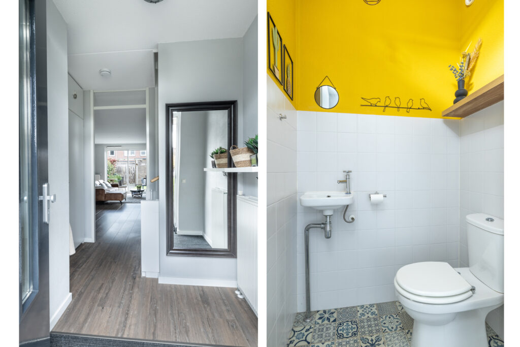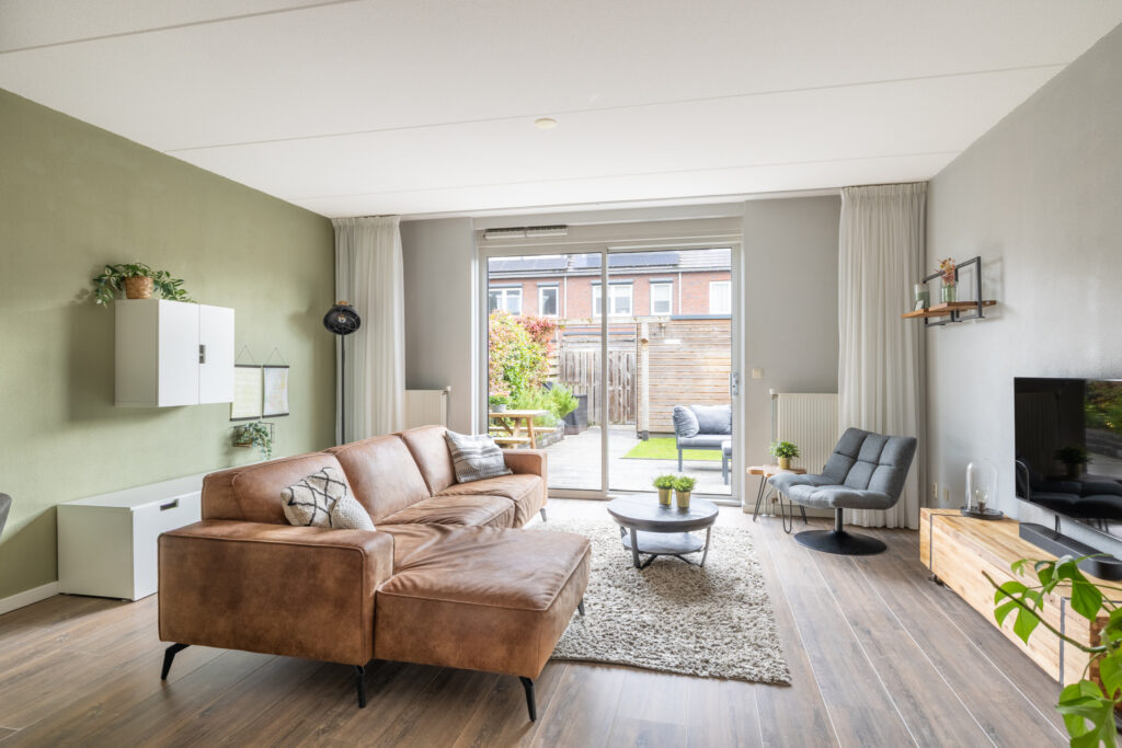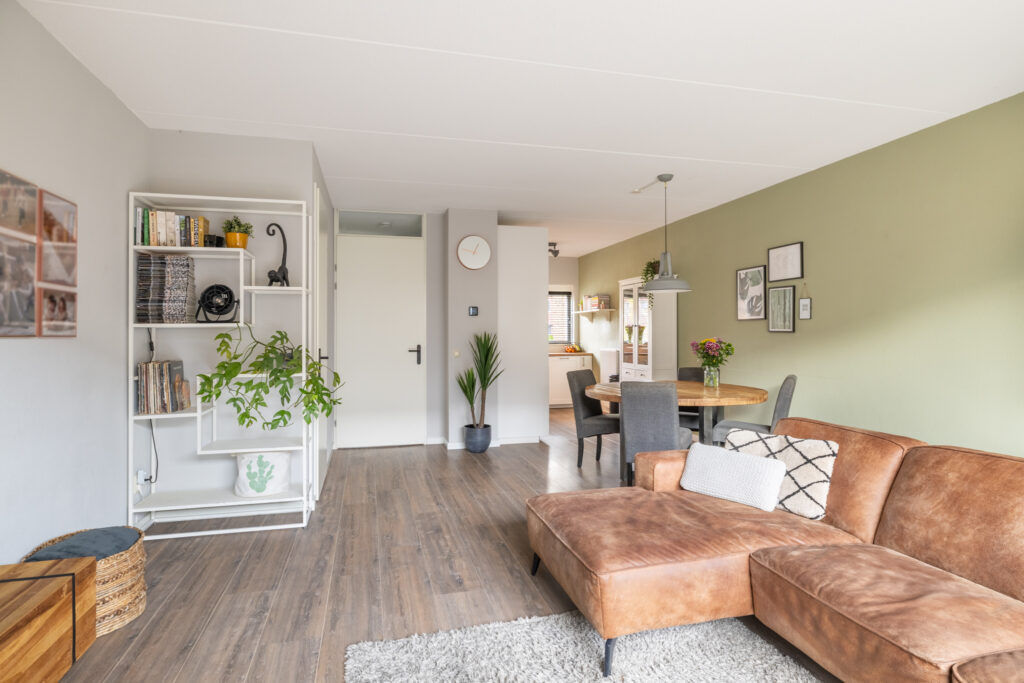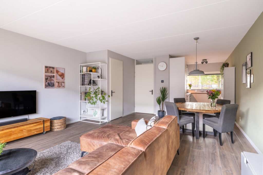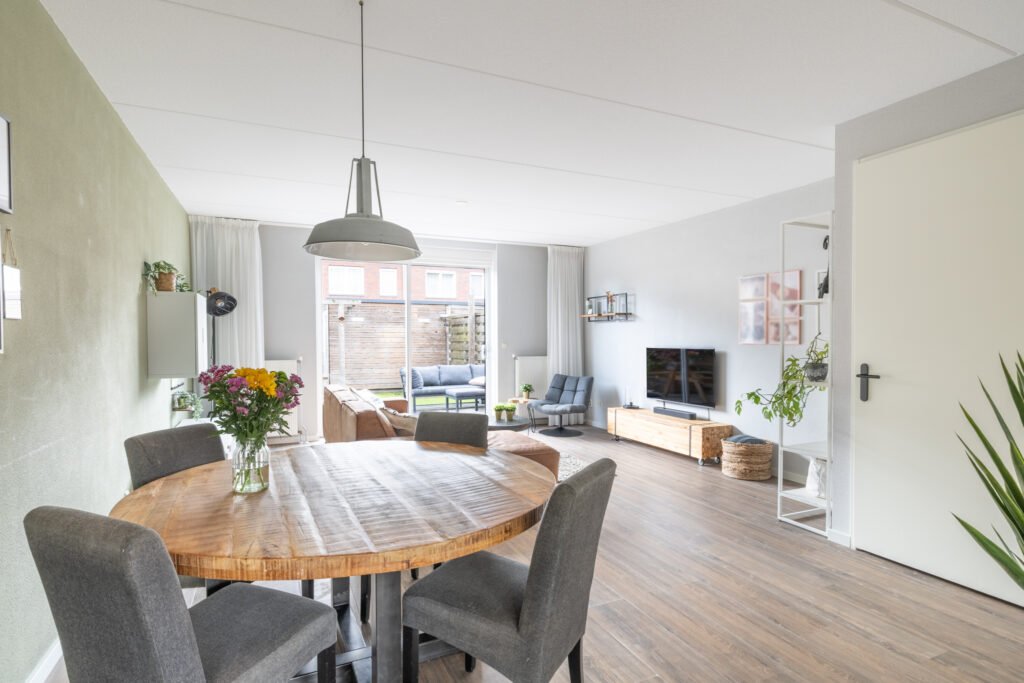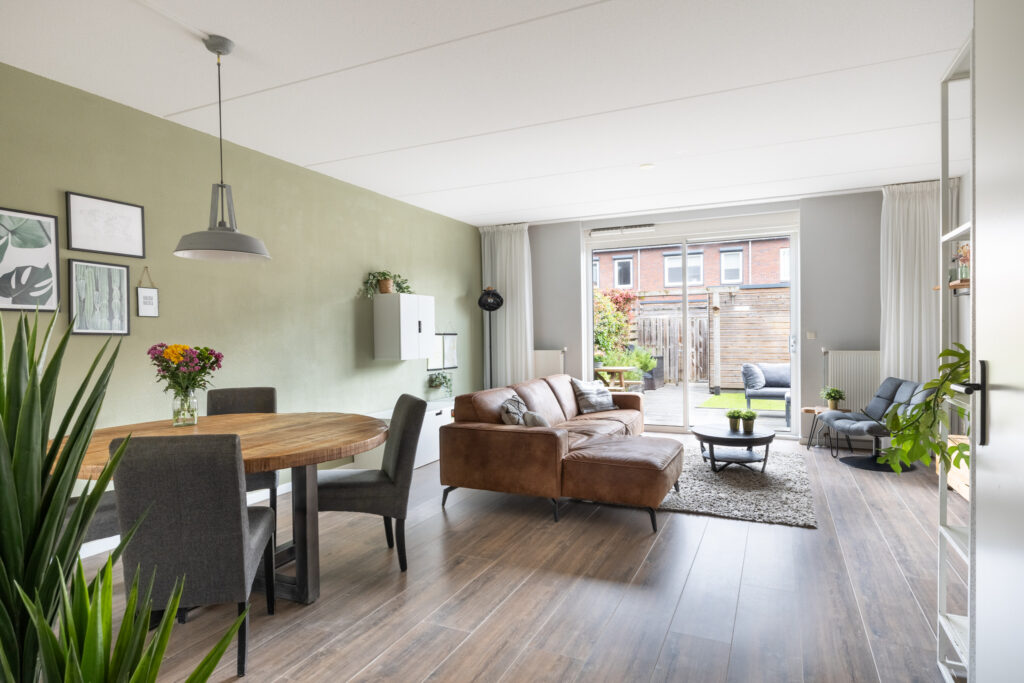 Via de hal met toilet en meterkast kom je in de ruime, uitgebouwde woonkamer met schuifpui naar de tuin. De kamer is heerlijk licht en praktisch ingedeeld.