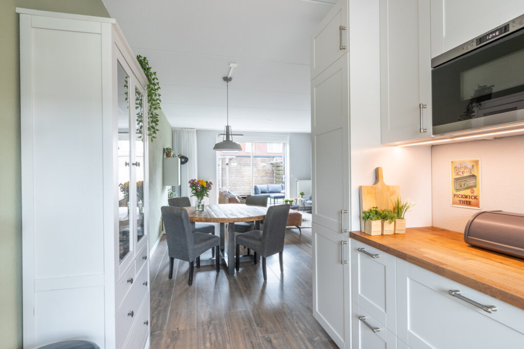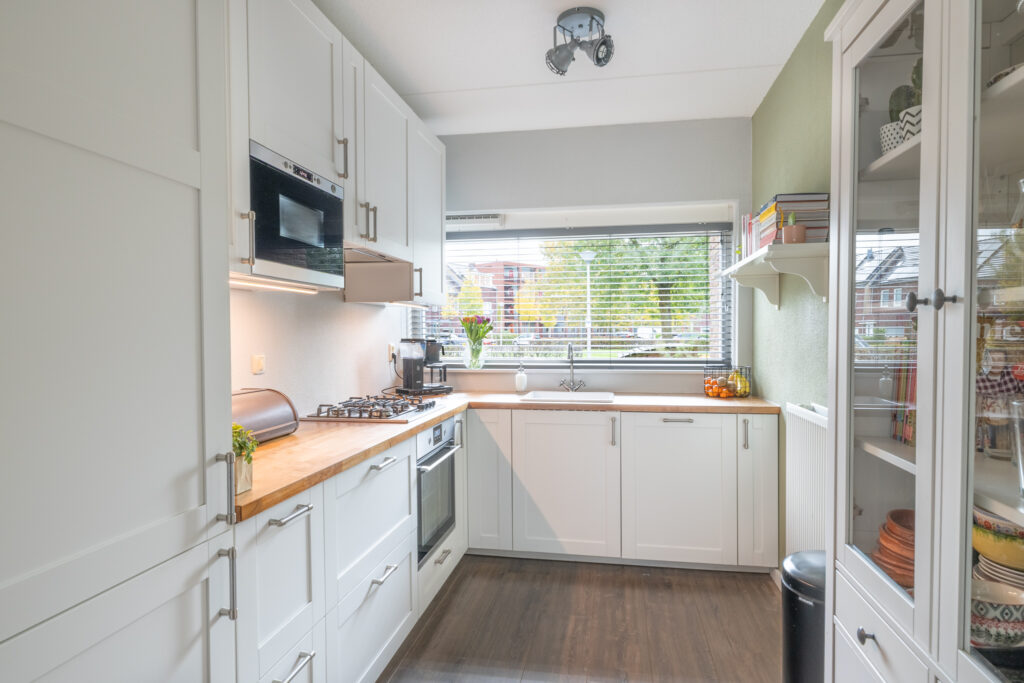 Aan de voorzijde ligt de keuken in L-opstelling, met een groot raam en uitzicht op het speelveldje. De keuken is voorzien van moderne inbouwapparatuur, waaronder een vaatwasser, gaskookplaat, oven, afzuigkap en koelkast.