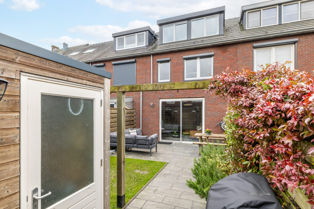 Achterin de tuin staan een houten berging en een achterom voor extra gemak.