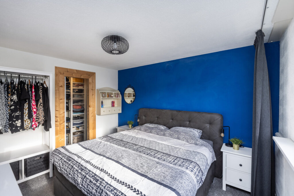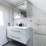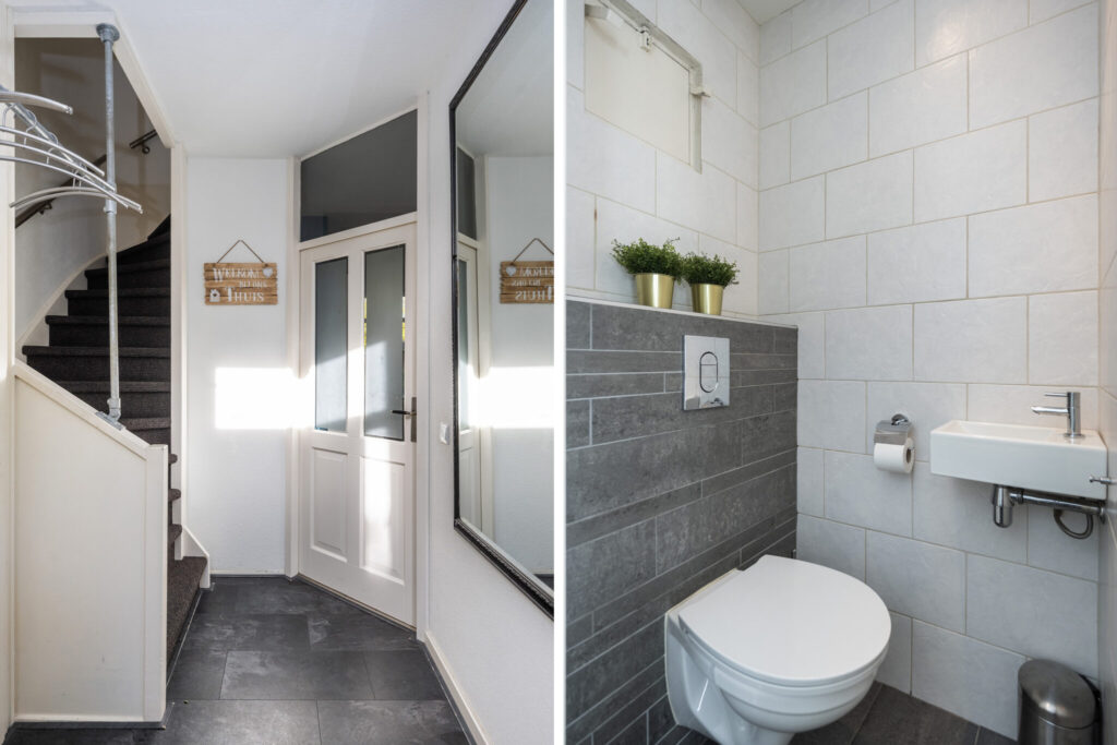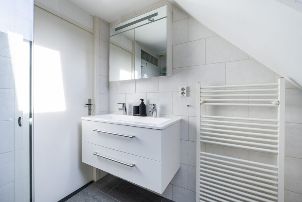 Op de eerste verdieping zijn drie slaapkamers, waaronder een ruime slaapkamer aan de voorzijde met inloopkast. De badkamer is praktisch en modern met dubbele wastafels, een regendouche en een tweede toilet.