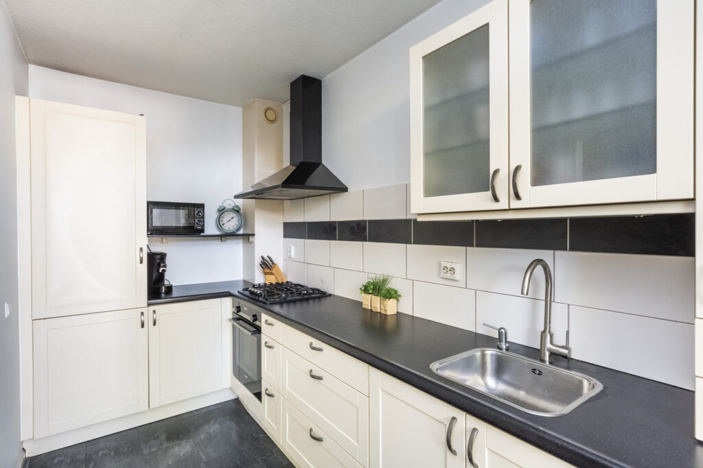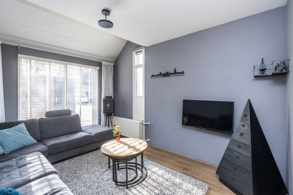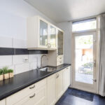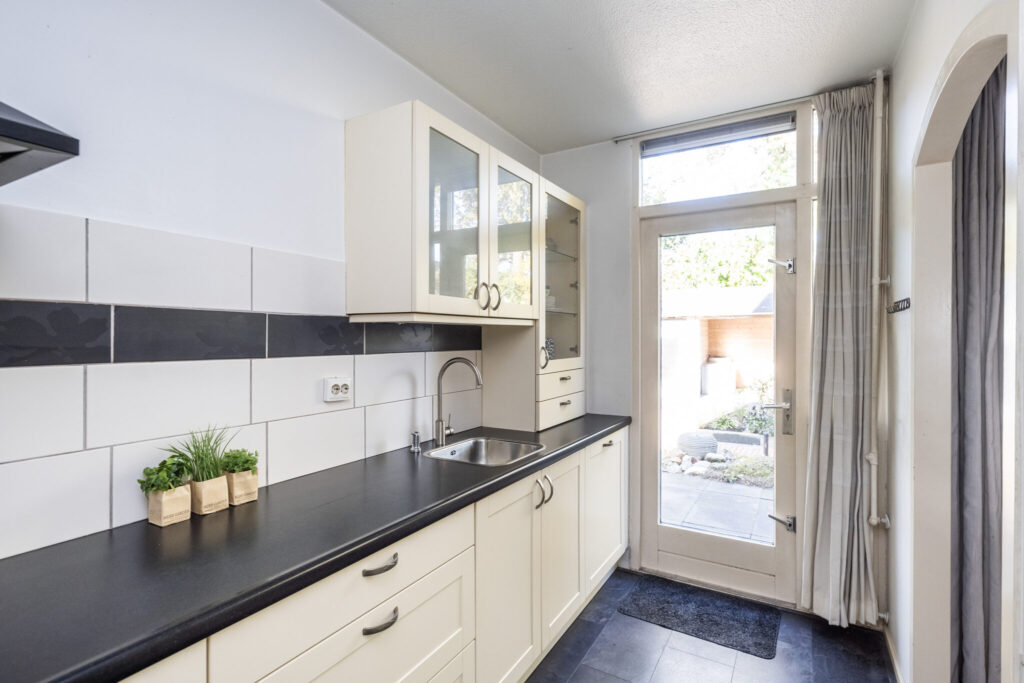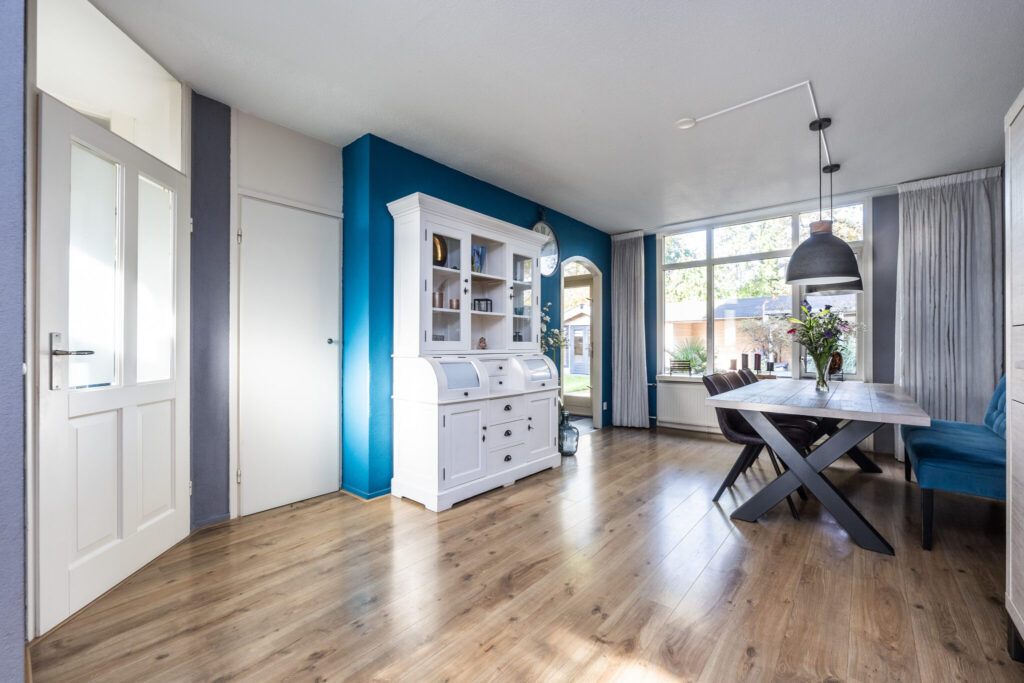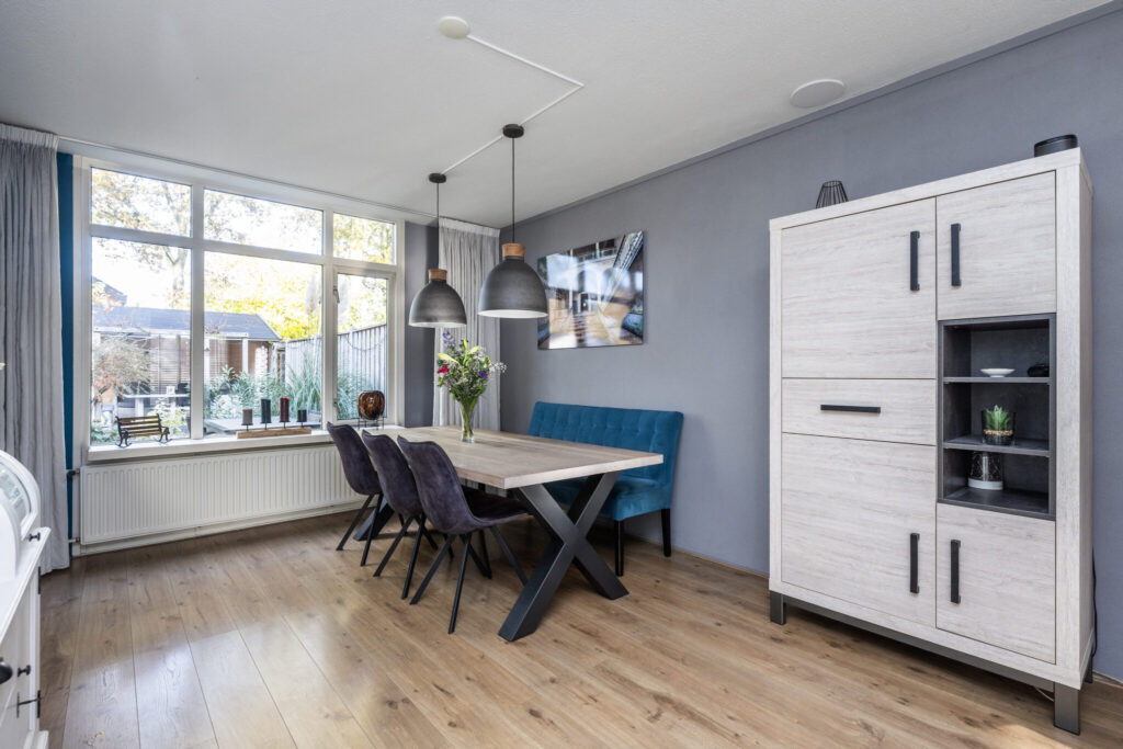 De woonkamer ligt aan de voorzijde en heeft veel lichtinval door de grote ramen. Aan de achterzijde is ruimte voor een eethoek met uitzicht op de tuin. De keuken beschikt over diverse inbouwapparaten en heeft een deur naar buiten.