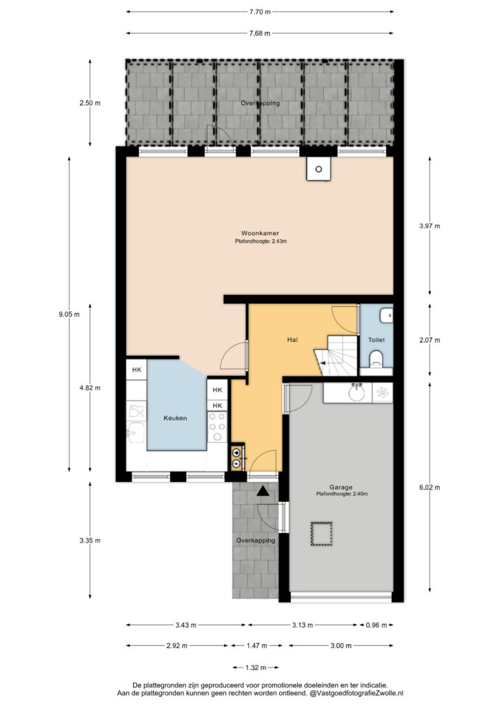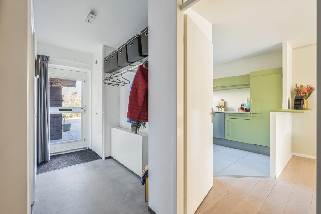 Je komt binnen in de royale hal met meterkast en garderobenis. Vanuit hier heb je toegang tot de inpandige garage, het modern afgewerkte toilet en de open keuken.