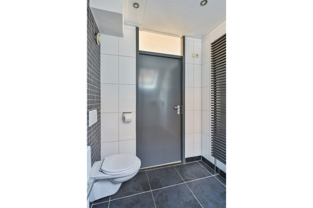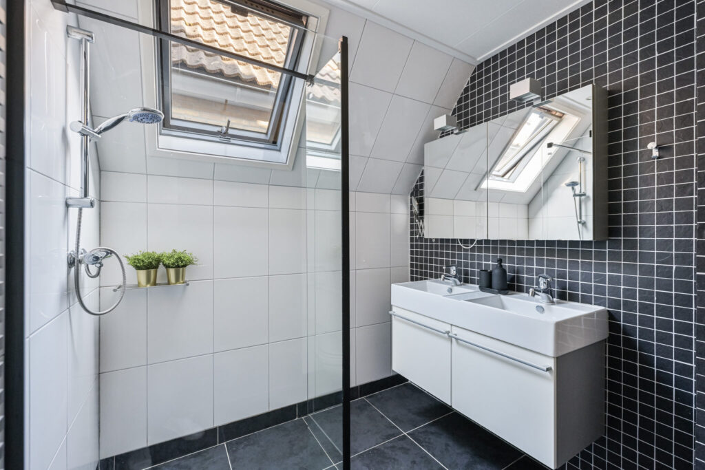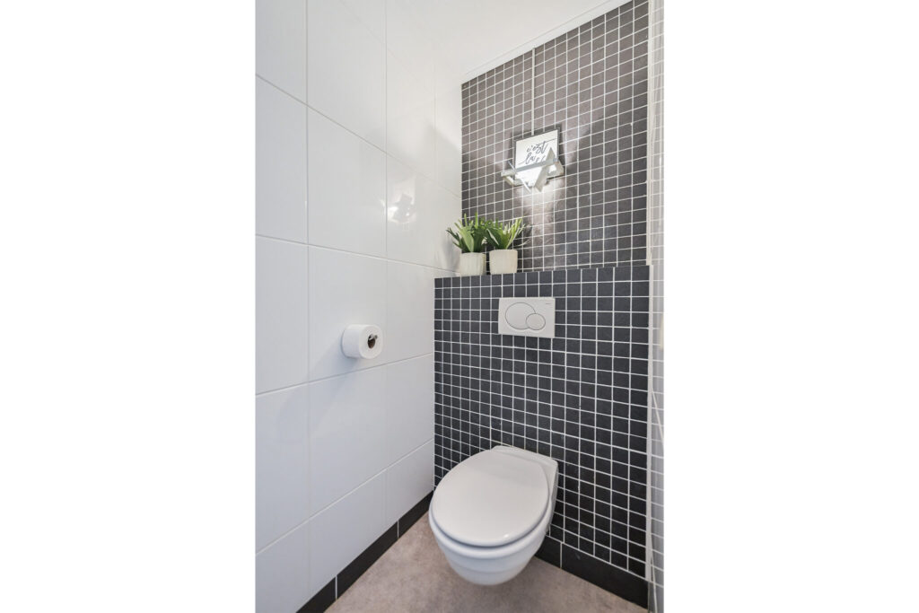 De badkamer is modern uitgevoerd en voorzien van een inloopdouche, dubbele wastafel met meubel, designradiator en een toilet. De wasmachine en droger zijn praktisch opgesteld in een afgesloten wasruimte.