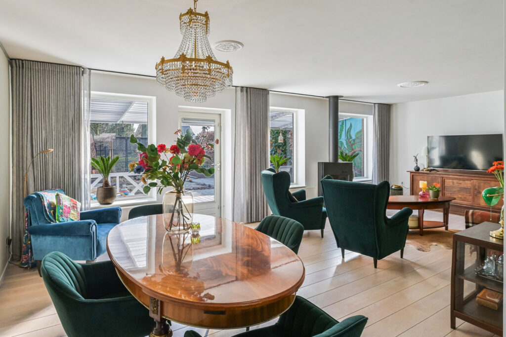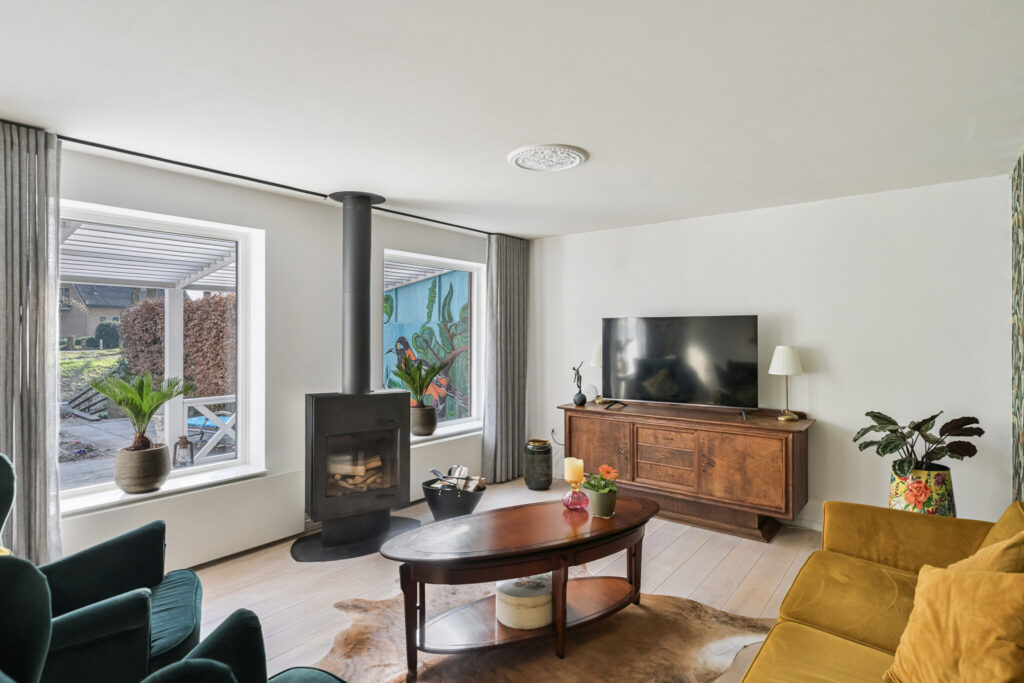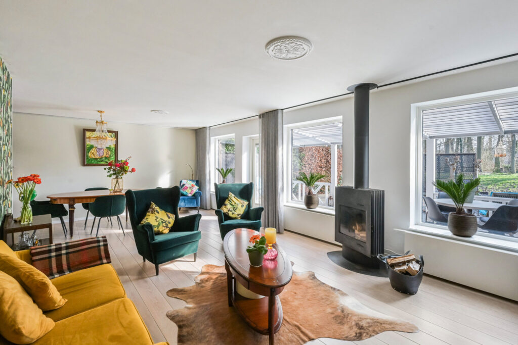 Aansluitend aan de keuken bevindt zich de woonkamer met eethoek en vervolgens de zitkamer. De woonkamer heeft grote raampartijen en biedt een vrij uitzicht over de achtertuin en het achtergelegen Marsbos. Hierdoor ervaar je hier niet alleen veel daglicht, maar ook rust en privacy. In de woonkamer kun je op koude winteravonden genieten van de prachtige draaibare design houtkachel. De begane grond is afgewerkt met een mooie eikenhouten vloer.