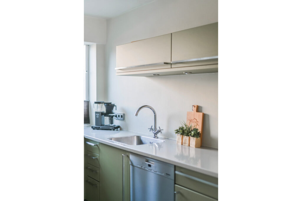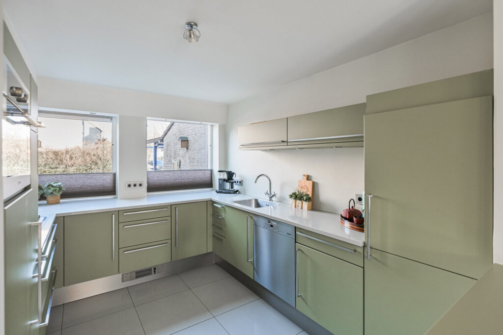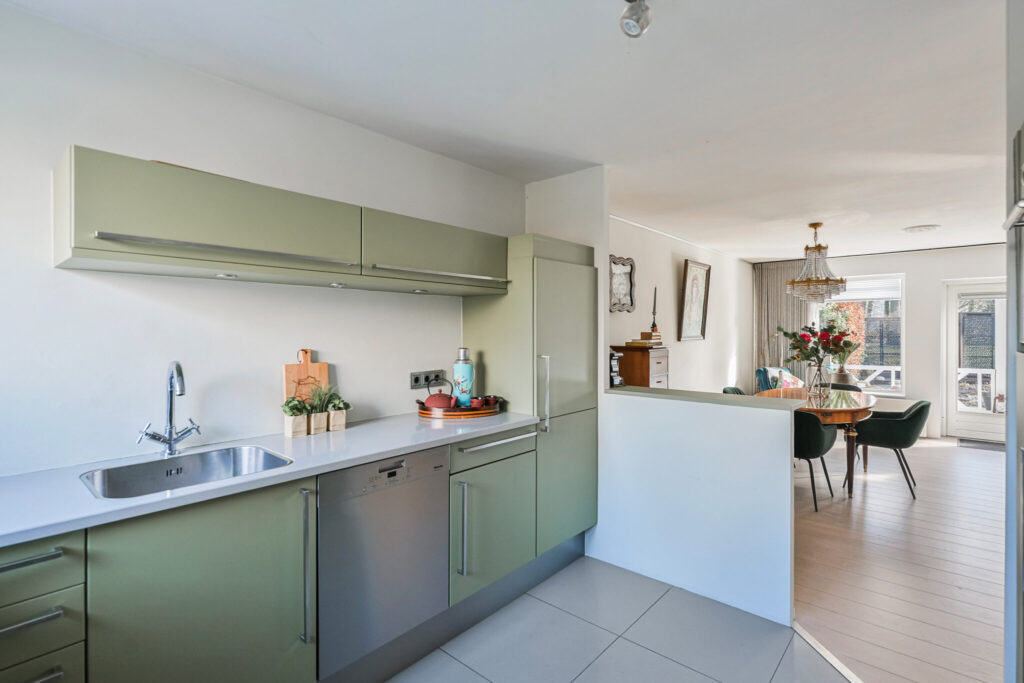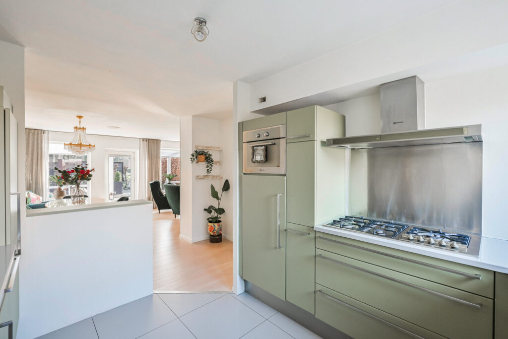 De keuken ligt aan de voorzijde van de woning en is opgesteld in een praktische U-vorm. De keuken is voorzien van diverse inbouwapparatuur, waaronder een 5-pits gaskookplaat, afzuigkap, combi-oven/magnetron, koelkast en vaatwasser. Het werkblad is uitgevoerd in composiet.