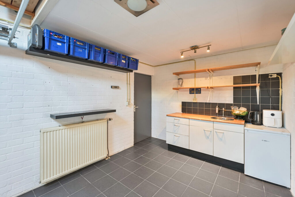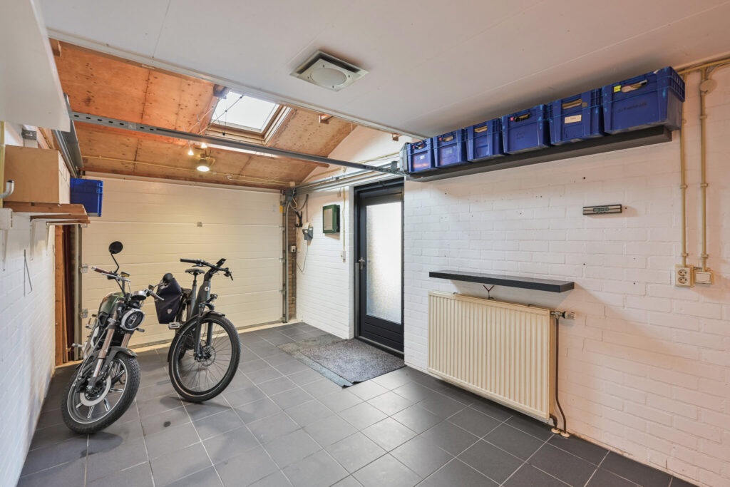 De inpandige garage met spouwmuur is vanuit de hal bereikbaar. De garage beschikt over een elektrische overheaddeur en een loopdeur naar buiten. Daarnaast is er een aanrecht met kraan aanwezig.