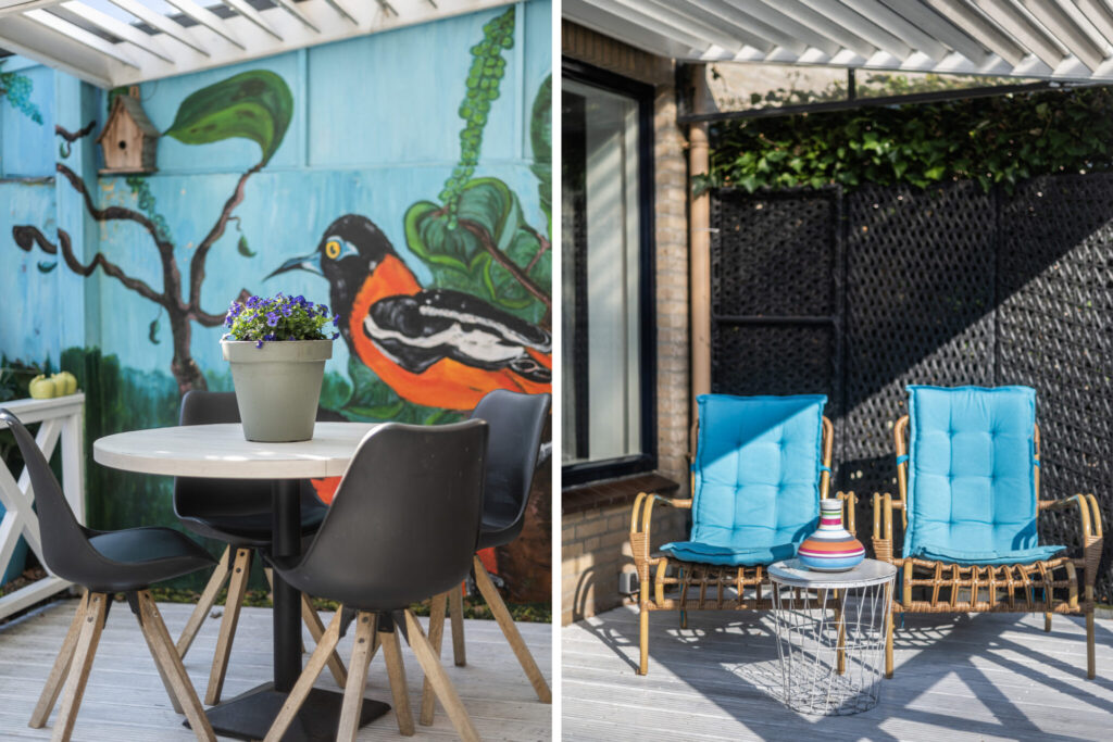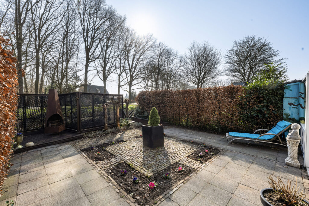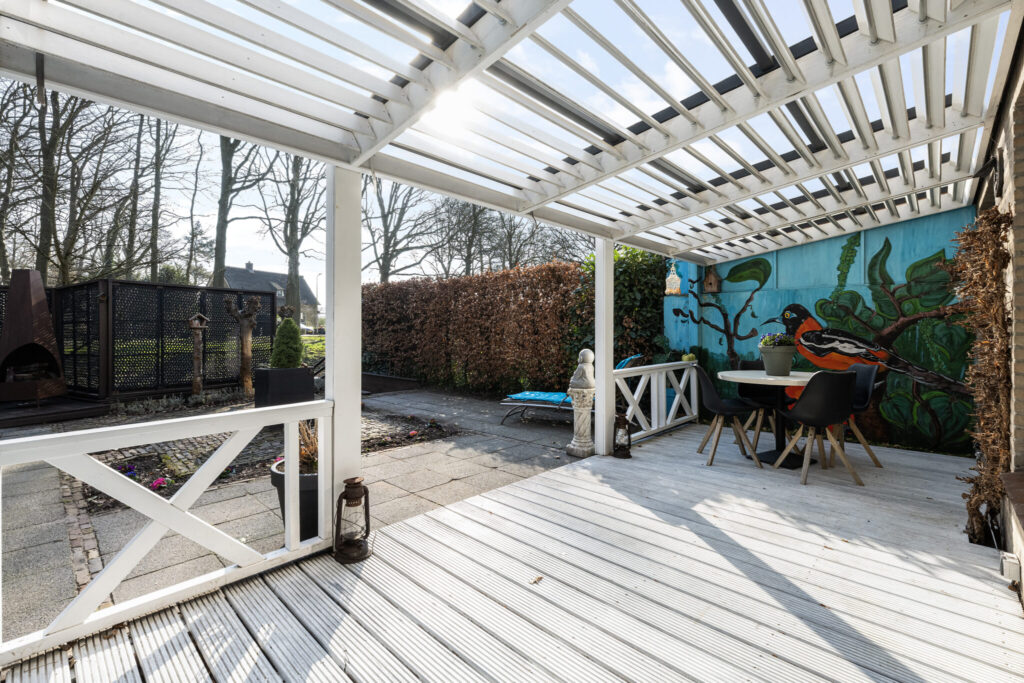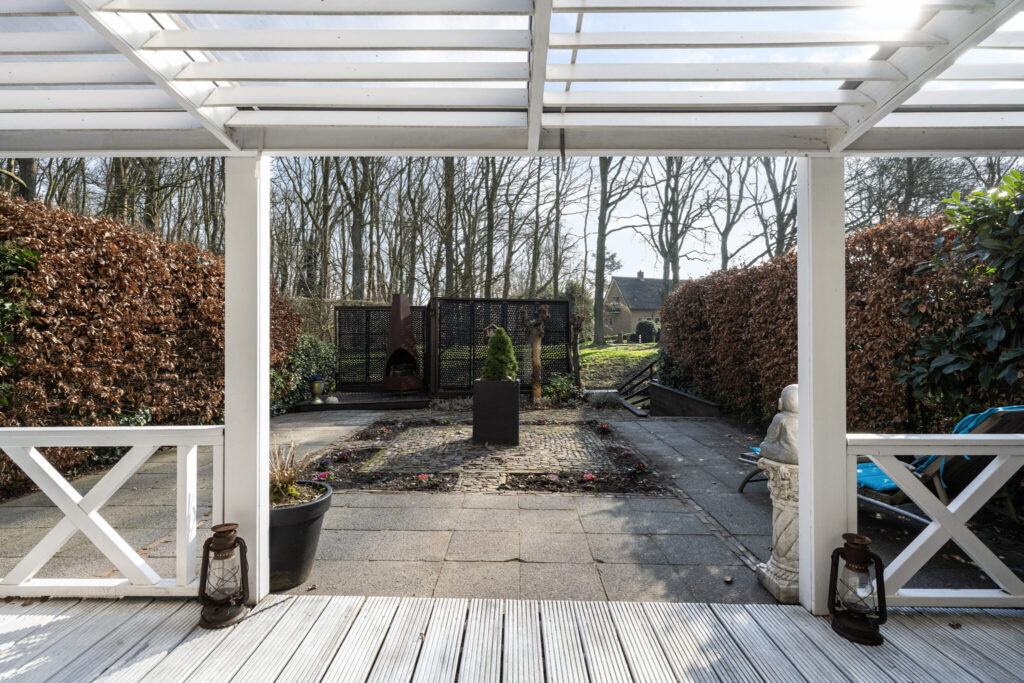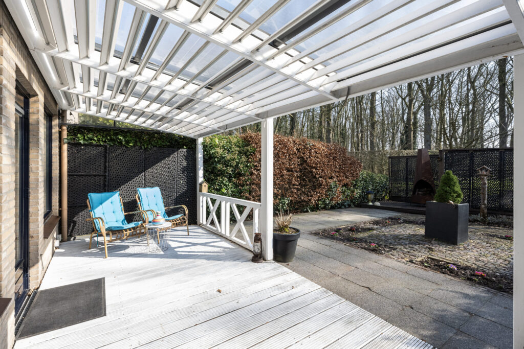 Via de loopdeur stap je onder de overkapping in de achtertuin, waar je al snel heerlijk van de zon en het uitzicht kunt genieten.
