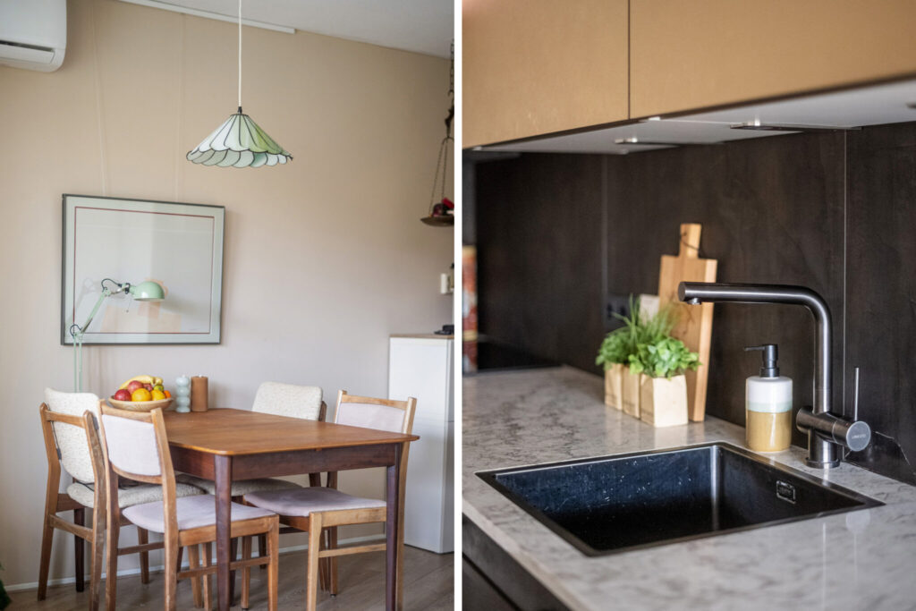 De moderne keuken uit 2021 is compleet ingericht met inbouwapparatuur en een stijlvol composiet werkblad.