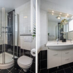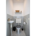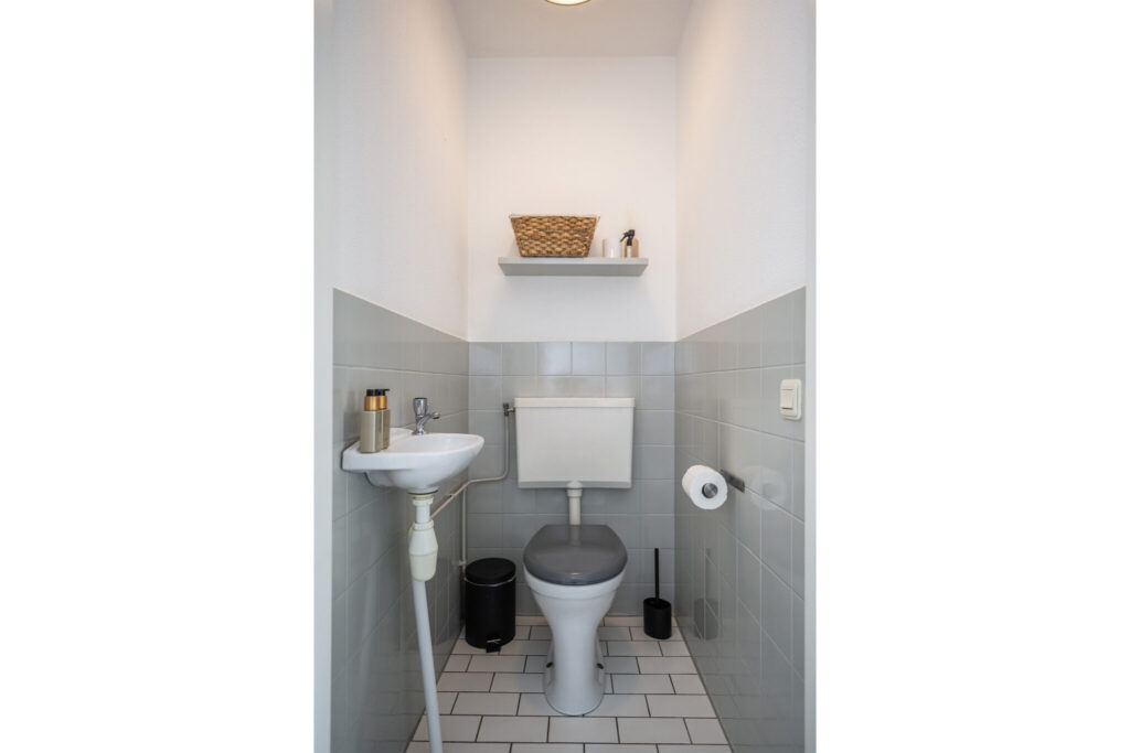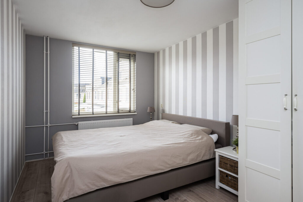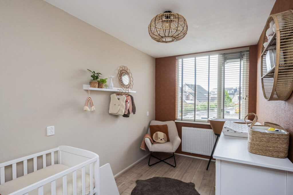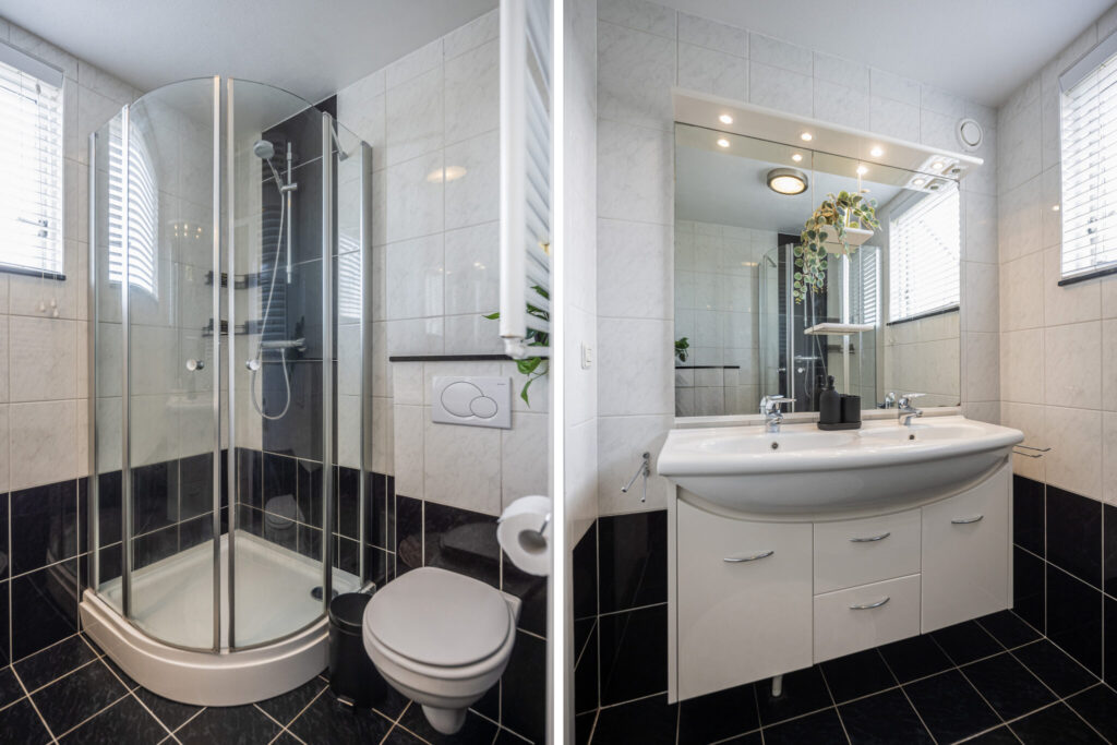 Vanaf de overloop, voorzien van een deur die warmte en geluid van beneden tegenhoudt, bereik je drie slaapkamers. De ruime ouderslaapkamer ligt aan de achterzijde. Alle kamers hebben een doorlopende laminaatvloer met brede delen. De badkamer is compleet ingericht met een douchecabine, tweede toilet en wastafelmeubel met dubbele kraan.