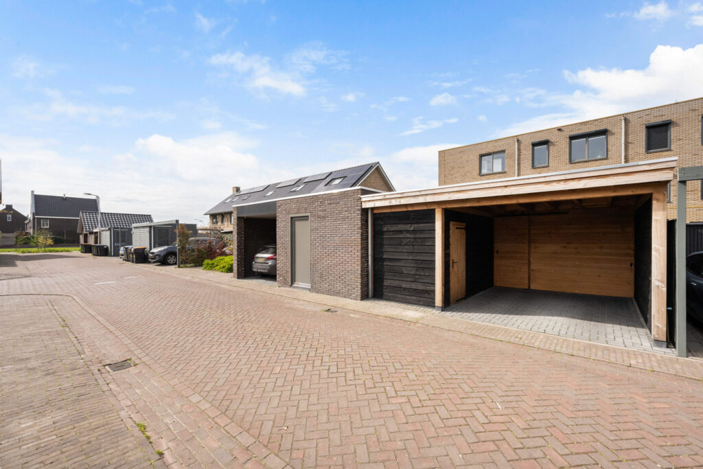 Aansluitend bevindt zich een diepe berging van circa 6 meter, voorzien van water en elektra. Achterin de tuin is een eigen parkeerplaats met carport gerealiseerd, met de mogelijkheid om een laadpunt voor een elektrische auto te plaatsen.