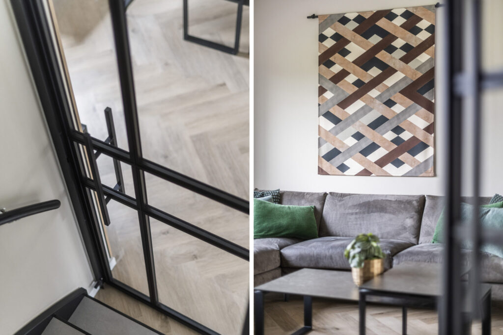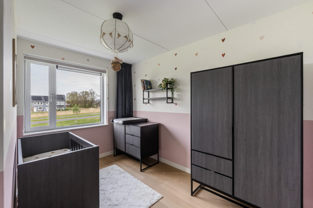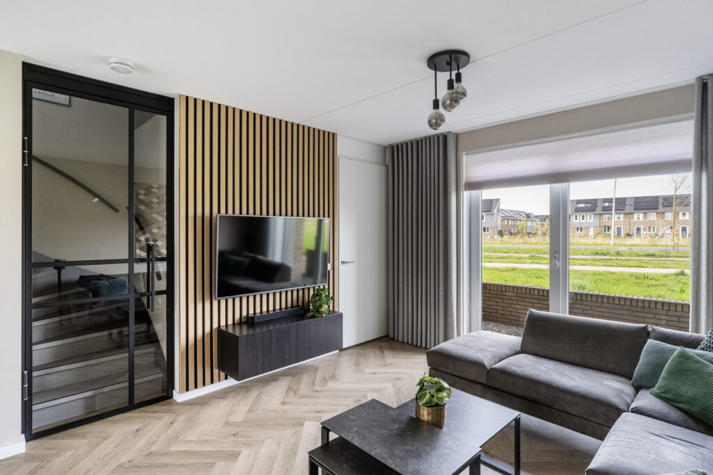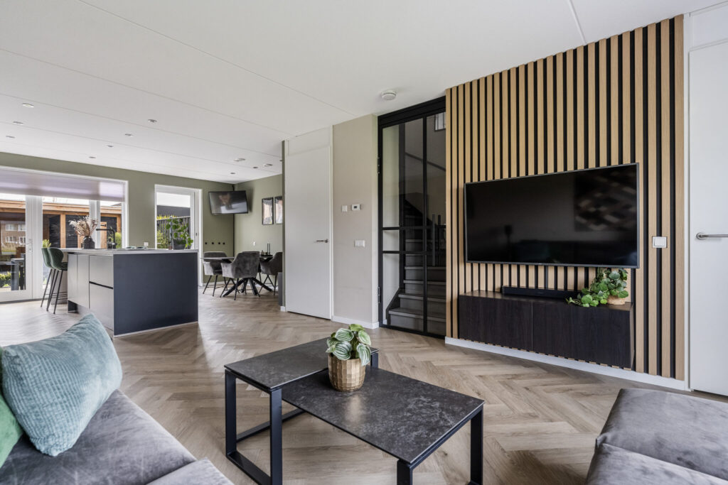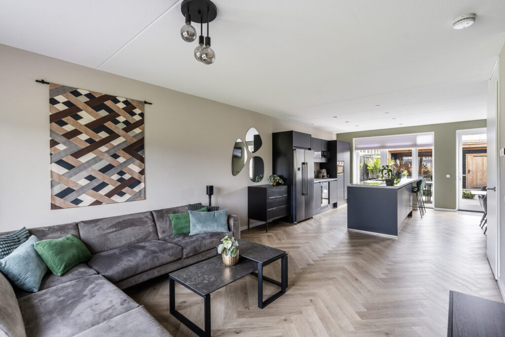 Bij binnenkomst valt direct de ruimte op. De woonkamer is tijdens de bouw uitgebouwd, wat zorgt voor een fijne, lichte leefruimte waar je alle kanten mee op kunt. De strakke afwerking met gestucte wanden en een pvc-vloer geeft het geheel een rustige en moderne basis.