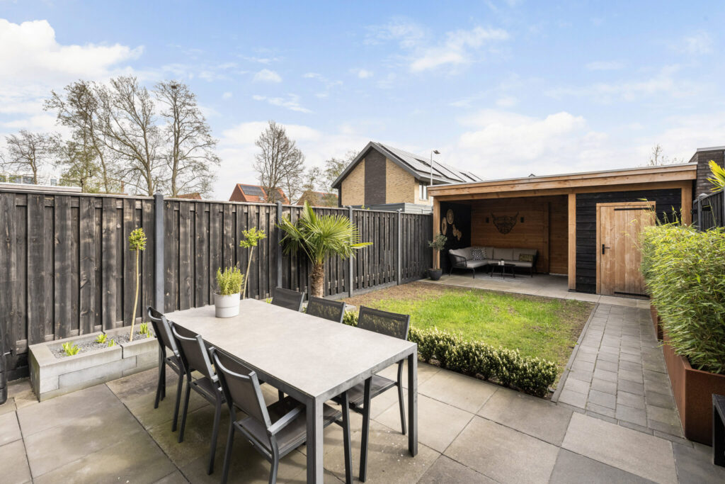 De achtertuin ligt op het zuiden, waardoor je hier de hele dag en tot in de avond van de zon kunt genieten. De tuin is verzorgd aangelegd en voorzien van een overkapping uit 2025, een fijne plek om buiten te zitten, ongeacht het seizoen.