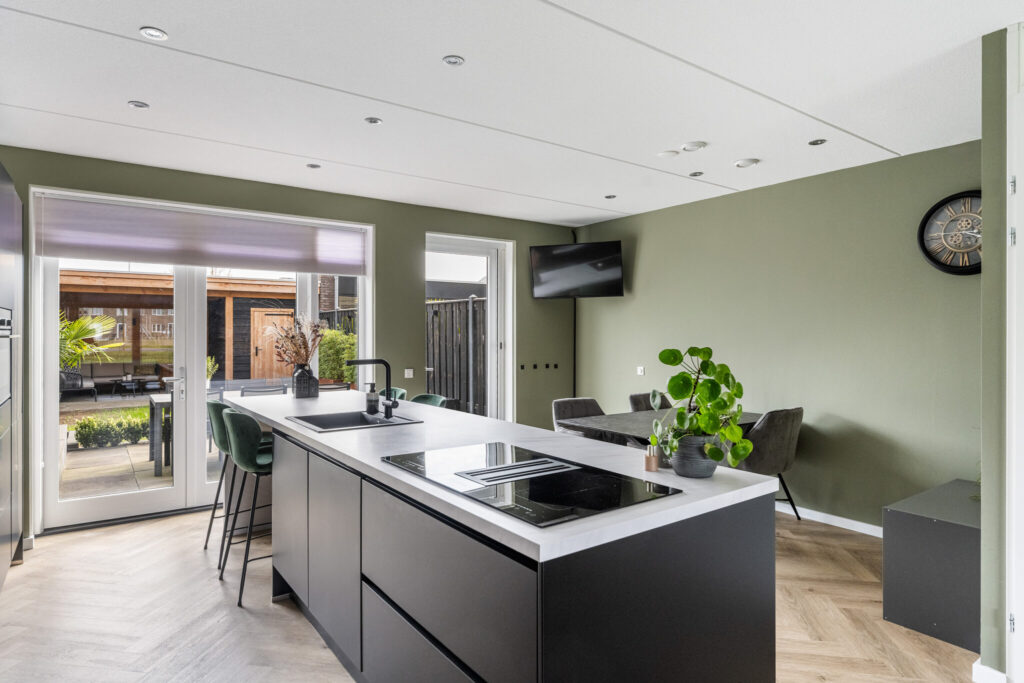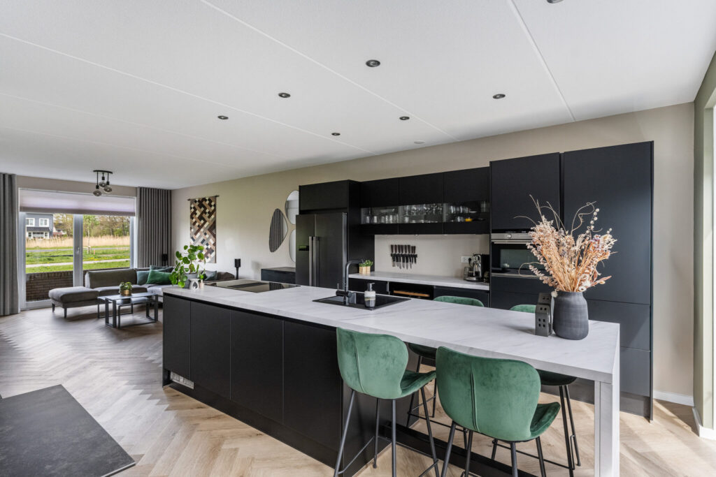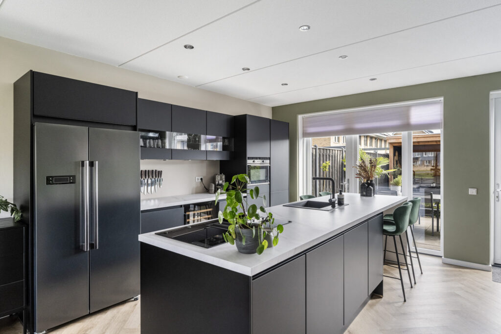 Aan de achterzijde ligt de leefkeuken, zo’n plek waar je de dag begint met een kop koffie aan het eiland en ’s avonds nog even blijft zitten na het eten. De keuken is luxe uitgevoerd met een kook- en spoeleiland en biedt volop werk- en bergruimte. Extra’s zoals een Amerikaanse koelkast en een wijnklimaatkast maken het geheel compleet.